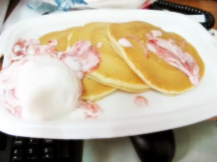 This is a picture of what I am eating at this very moment... HotCakes with strawberry ice-cream